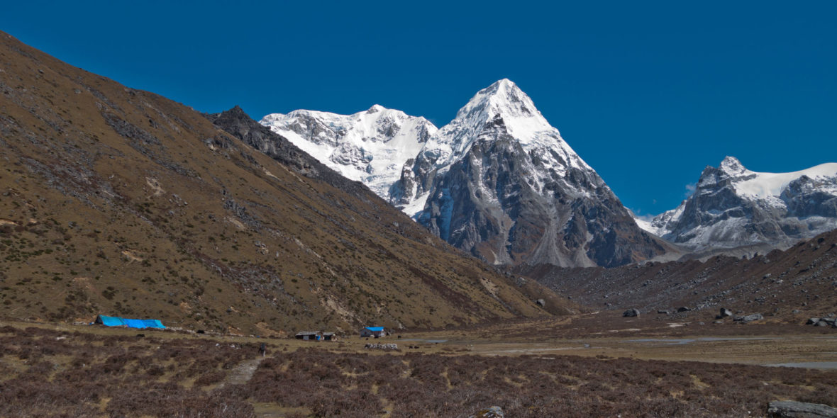 We have a big day ahead of us today, so we head out early morning, following the lateral moraine towards Pangpema. There are some fairly big ups and down crossing some recent landslides but otherwise it is a gradual climb all the way. Views of Chang Himal, Nepal Peak and Gimmigela peak are stunning. After about four hours trekking, we reach Pangpema and get the stunning Kanchenjunga views. Neither sunset nor sunrise are spectacular from Pangpema, so on this middle of the day visit you’ll catch the mountains in the best light. Combined with the altitude, this is a long and tough day, do bring plenty of snacks and water. Your guide will advise on whether the simple lodge at Pangpema is open, or not, for lunch.