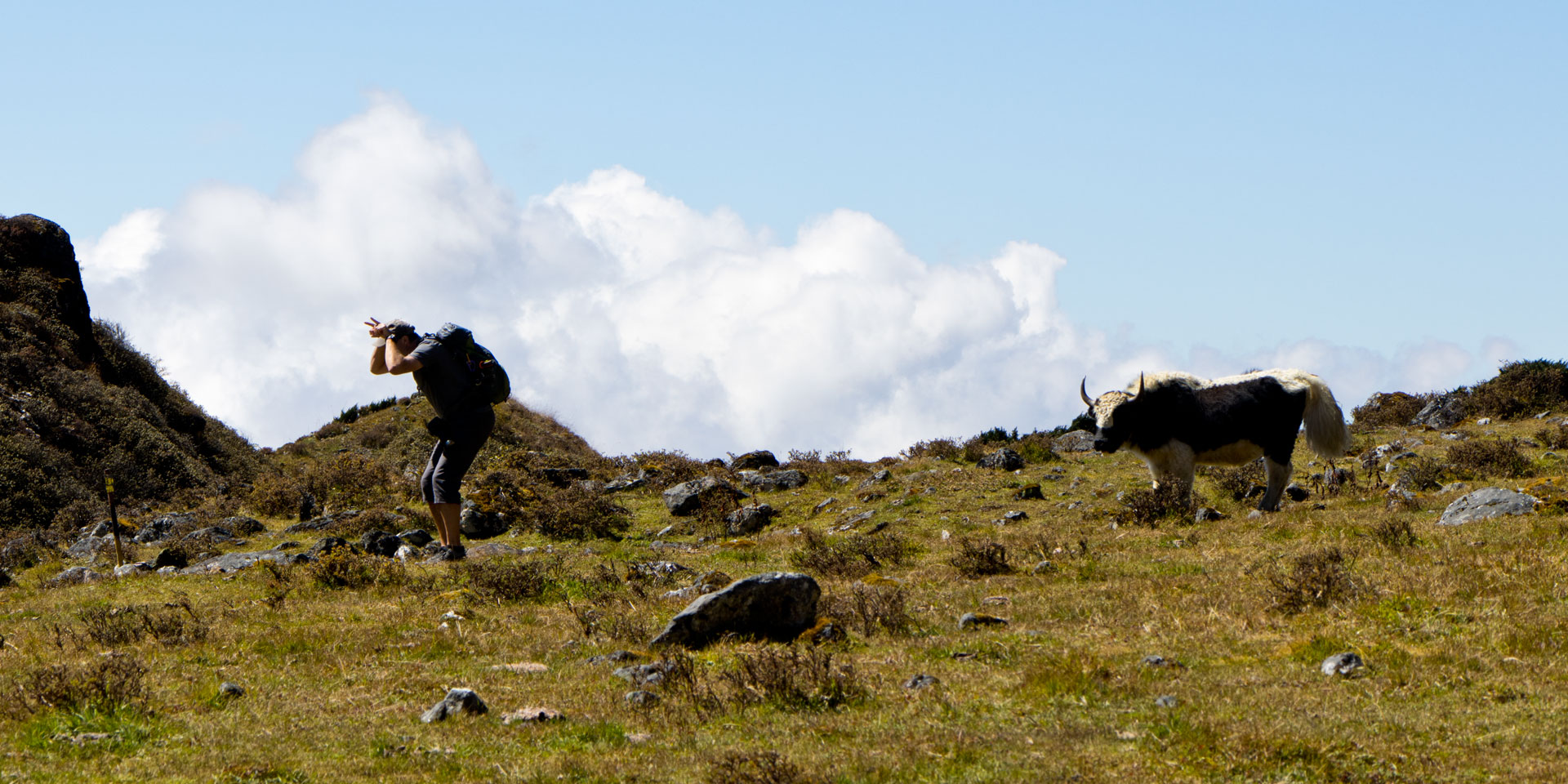 A big day today, with around a 1000m climbing to the top of Nango La (pass), so we start early. We follow the stream up through the valley heading straight east till we come out of the vegetation and above the treeline come to a couple of old stone huts, used in the summer for greasing. Here we turn south and will soon be able to see the top of the Nango La, the amazing views of the Sarphu peaks are behind us, so do stop and turn around to enjoy the view now and then. The best view of course is from the top of the pass, enjoy it but don’t hang around for too long as we are pushing it a bit with the altitude here. We descend fairly fast on good trail and about an hour below the pass, we come to our camp for the night at Kharka. Here there is again a porters shelter, so a good place to stop.