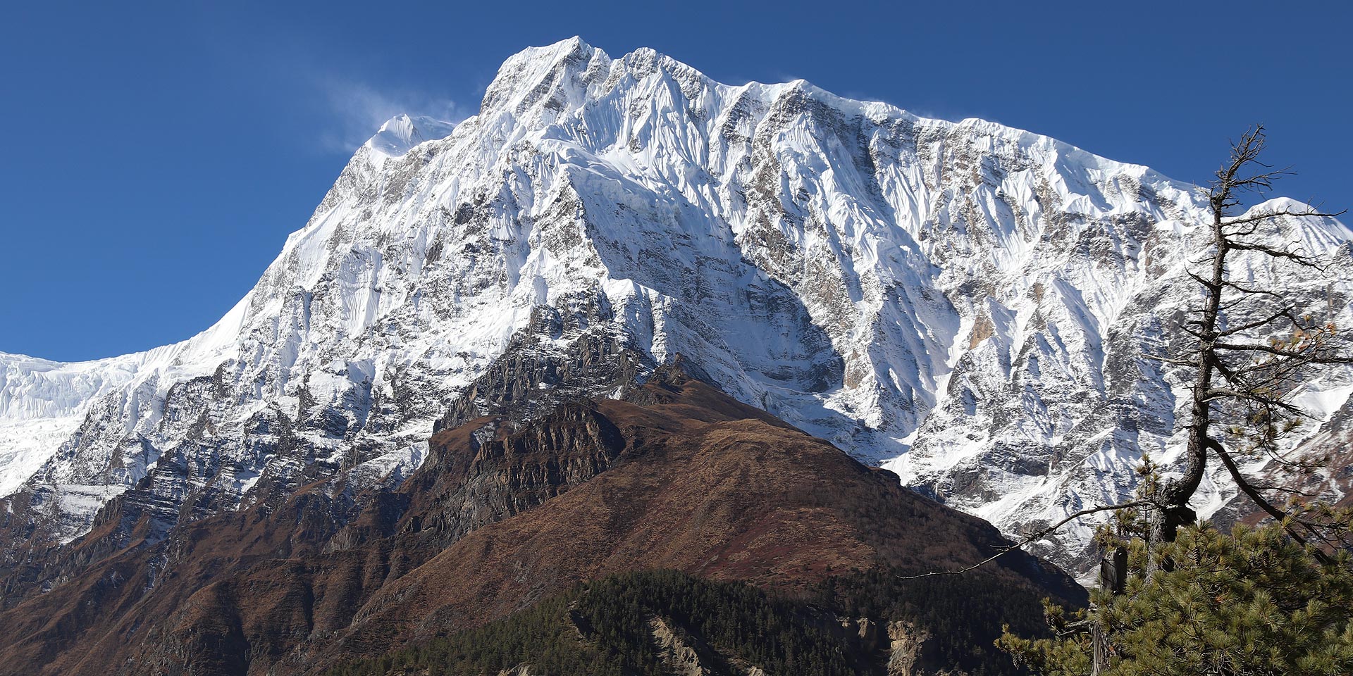 We now walk through a pine forest and as the forest ends, the valley changes from a V-shape to a gentle U-shape, opening up a wonderful vista before us. We can see the east peak of Annapurna II as well as Pisang Peak to the north-east. Continuing on, we come to a long mani wall by a bridge and the lower village of Pisang.
