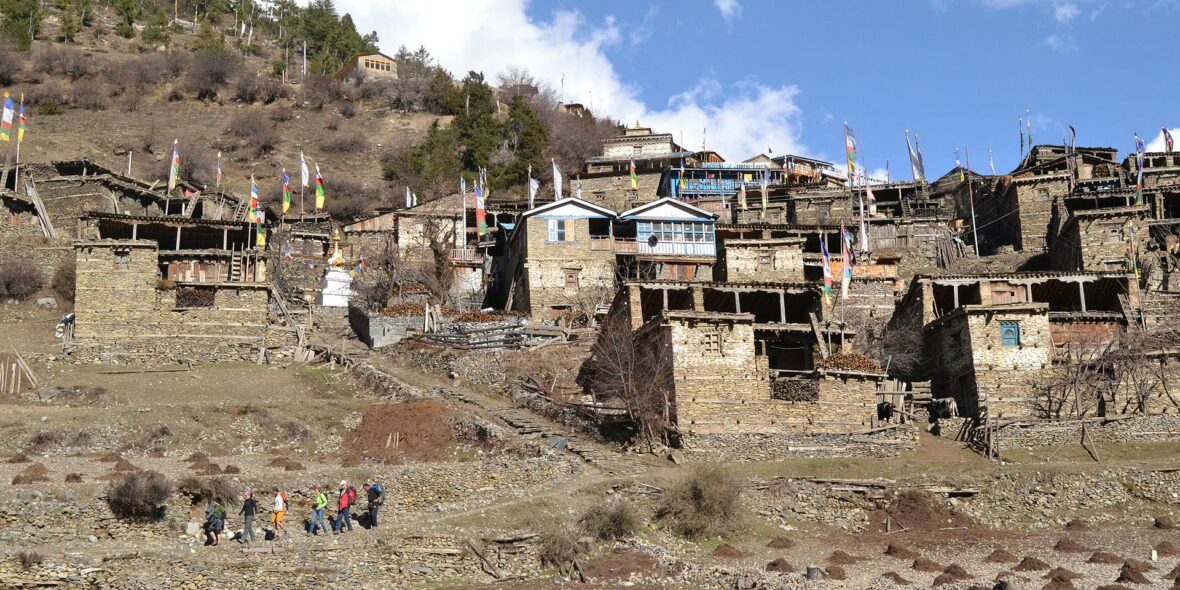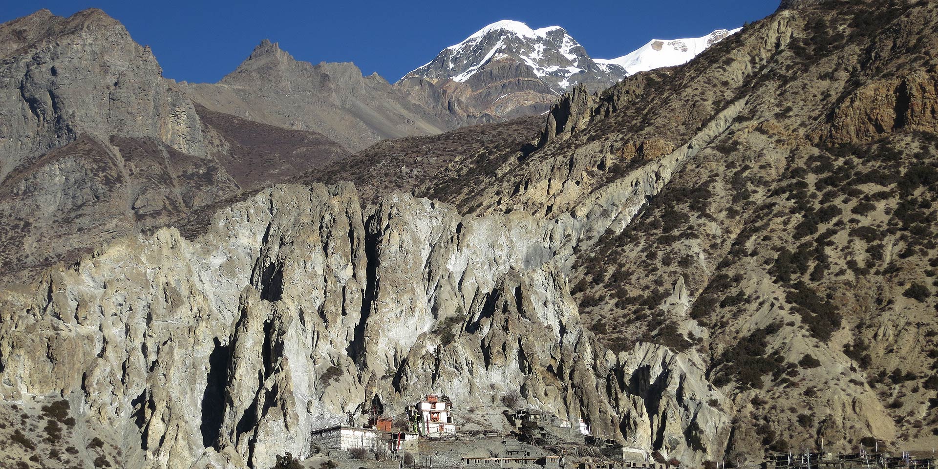 Beyond Pisang, the trail climbs a steep ridge which affords good views of the Manang valley and Tilicho peak. Descending past Manang’s airstrip at Hongde, we come to a level area from where the north-east face of Annapurna III rises majestically above us. From the wide plains of the Sabje Khola Valley, Annapurna IV [7525m] also becomes visible. Just beyond this point we cross the considerably reduced flow of the Marsyangdi Khola via a wooden bridge to the tiny village of Mungji. Cultivated fields appear on both sides of the path and off to the right, below a craggy mountain, we can see the village of Bryaga with its splendid monastery. Large chortens and mani walls abound and the tall peaks of the Himalaya spread out before us – Annapurna II, Annapurna III, Annapurna IV, Gangapurna [7455m] and, to the rear, Tilicho Peak [7134m]. After a short steep climb we reach Manang which is a surprisingly large village for this remote mountain region.