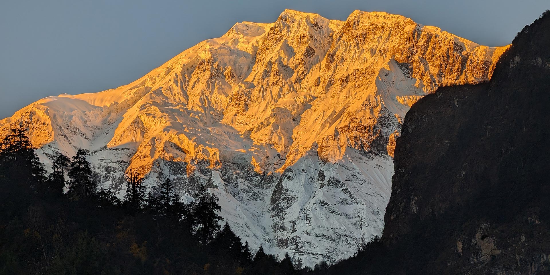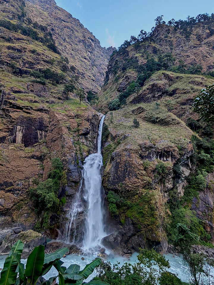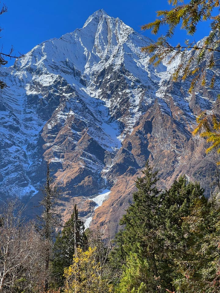 With Lamjung Himal [6893m] sparkling in the morning sun, we set off for Pisang. The mountain disappears as we climb the path up the valley, passing a huge apple orchard. We continue through a fir and pine forest, climbing to a high, rocky area as the opposite bank becomes an impassable cliff.
