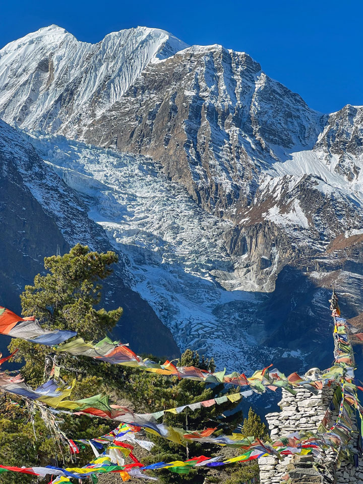 An important rest and acclimatisation day today before crossing the Thorung La. There are optional day walks such as crossing the river to see the tremendous ice-fall coming down from the Annapurnas, or climbing high above the village for a full panorama of the Annapurna range and the Manang Valley. There is also a Himalayan Rescue Association [HRA] aid post in the village which makes an interesting and educational visit.