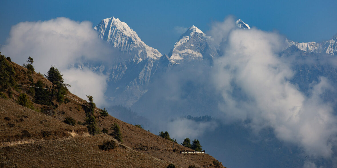 This morning we bid farewell to Junbesi and hit the trails again, bound for Taksindu. We cross the river at the ‘bottom’ of town and climb through forest up to Salung from where we get views of Mount Everest (8848m), Chamlang (7319m) and Makalu (8481m), weather permitting.